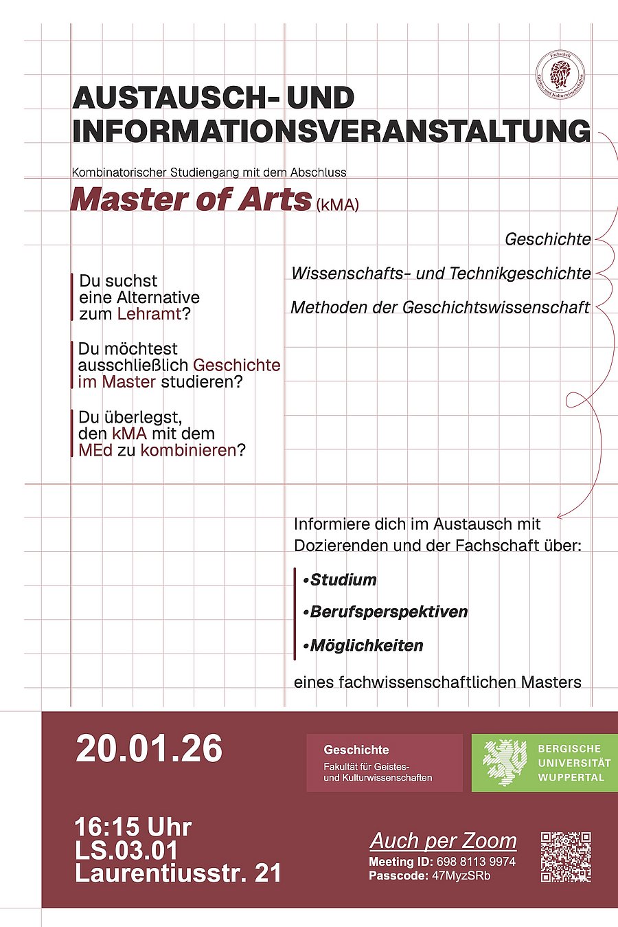 Unsere Geschichte veranstaltet am 20. Januar um 16:15 Uhr in der Laurentiusstraße 21 (LS.03.01) eine Austausch- und Informationsveranstaltung zum Kombi-Master (kombinatorischer Studiengang mit dem Abschluss Master of Arts). Bei diesem ist die Kombination zweier Teilstudiengänge möglich, aus der Geschichte kommen hier Wissenschafts- und Technikgeschichte, Methoden der Geschichtswissenschaft und Geschichte in Frage.