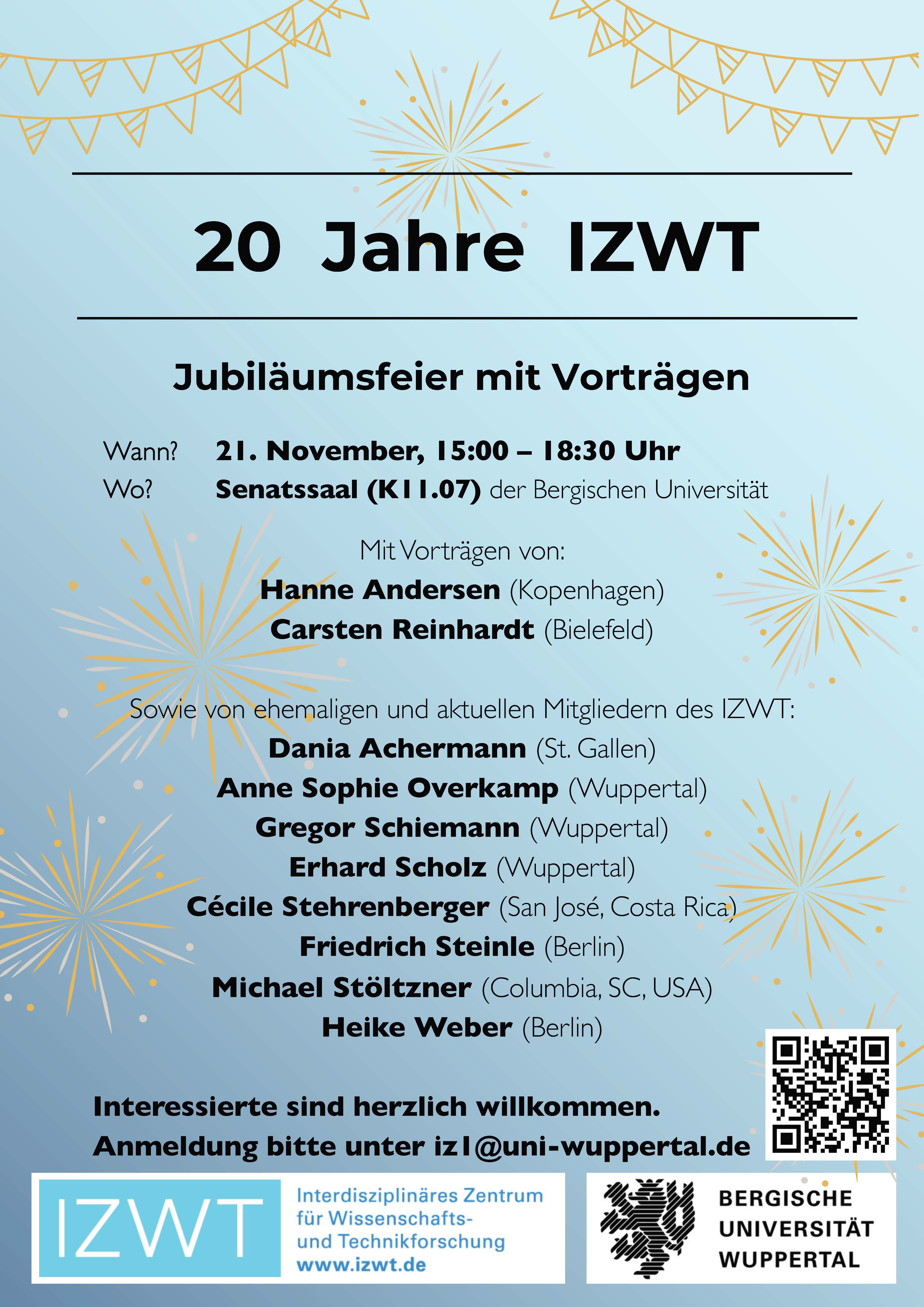 Die Jubiläumsfeier findet im Senatssaal der Bergischen Universität (K.11.07) von 15:00-18:30 Uhr statt. Begangen wird die Feier wird durch eine Fülle international besetzter Vorträge. Hauptvortragende sind Hanne Andersen (Kopenhagen) und Carsten Reinhardt (Bielefeld) sowie viele ehemalige und aktuelle Mitglieder des IZWT.