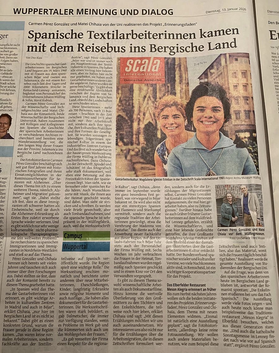 Prof. Dr Matei Chihaia und Dr. Carmen Pérez Gónzalez bereiten im Moment unter dem Titel "Erinnerungsfaden" eine Wanderausstellung vor, die den Weg der ersten spanischen Gastarbeiterinnen nachzeichnen soll, die 1960 aus der Provinz Salamanca ins Bergische Land kamen. Diesem Projekt hat die Westdeutsche Zeitung (WZ) nun einen Artikel gewidmet. Herzlichen Glückwunsch!